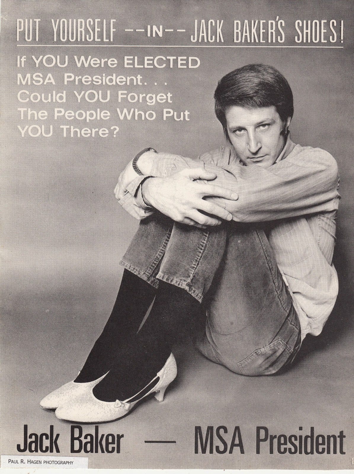 Higgins’s mentor had been the first openly gay president of a student union: a victory J.B. attributed to the sophistication of his University of Minnesota Law School colleagues: “Put yourself in my shoes,” ran campaign ads, showing the suave beefcake in kitten heels. The young attorney led a ragtag bunch of mischief makers in the North Star State – and fittingly for someone whose name was “Baker”, embraced whimsical pie-throwing as their preferred form of resistance.